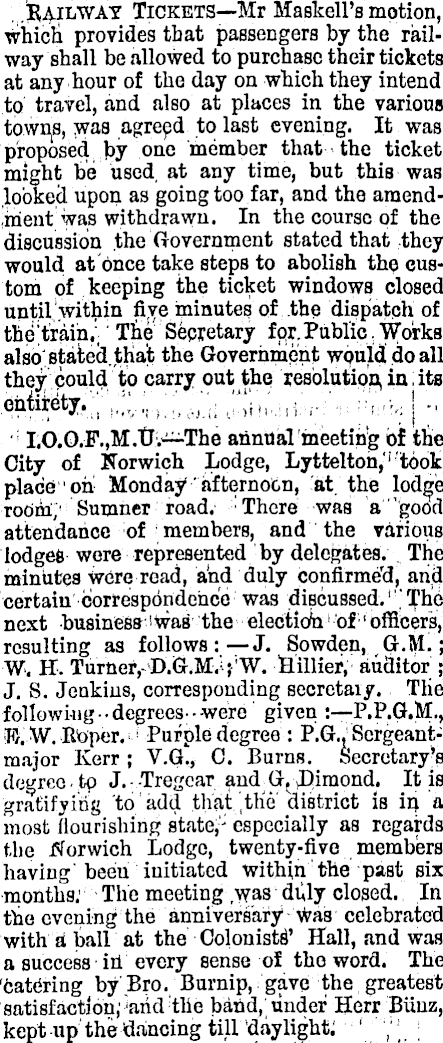 .Railway Tickets—Mr Maskell's motion, which provides that passengers by the railway shall be allowed to purchase their tickets at any hour of the day on which they intend to travel, and also at places in the various towns, was agreed to last evening. It was I proposed by one member that the ticket might be used at any time, but this was looked upon as going too far, and the amendment was withdrawn. In the course of the discussion the Government stated that they would at once take steps to abolish the custom of keeping the ticket windows closed until within five minutes of the dispatch of the train. The Secretary for. Public Works also stated, that the Government would do all they could to carry out the resolution, in,its 'entirety. ' ,[[ ,. .'.', ~'.; "1;,,, ,; I.O.O.F.,M.tJ.—The annualmeetirig of the City of Norwich Lodge, Lyttelton,'took place'on Monday afternoon, at the lodge room, Sumner road. There was a good attendance of members, and the various lodges were represented by delegates. The minutes were read, and duly confirmed, and certain correspondence was discussed. 1 The next business Was the election of' officers, resulting as follows:—J. Sowden, G.M.; W. 11. Turner, D.G.M. ; W. Hillier, auditor ; J. S. Jenkins, corresponding secretaiy. The following degrees - were given :—P.P.G.M., W. W. Eoper. Purple degree : P.G., Sergeantmajor Kerr ; V.G., C. Burns. Secretary's degree to J. Tregcar and G, Dimond. It is gratifying to add that the district is irj a most flourishing state,-especially as regards the Norwich Lodge, twenty-five members having beeu initiated within the past six months. The meeting was diUy closed. In the evening the anniversary was celebrated with a ball at the Colonists Hall, and was a success in every sense of the word. The •catering by Bro. Burnip, gave the greatest satisfaction, arid the band, under Herr Biuiz, kept up the dancing till daylight.