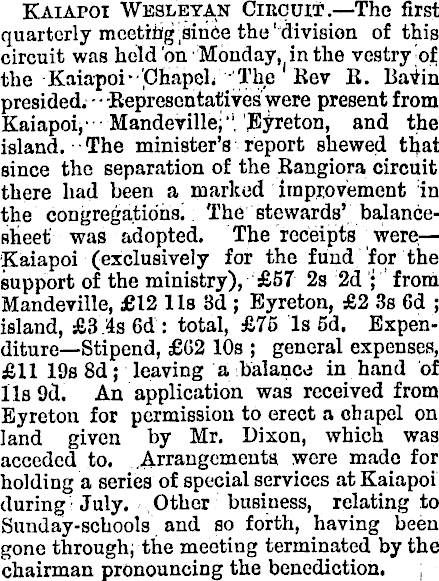 Kaiapoi Wesleyan Circuit.—The first quarterly meeting since the ! division of this circuit was held on Mouday, ( in the vestry of the Kaiapoi- Chapel. The Rev R. Bavin presided. -Representatives were present from •Kaiapoi, Mandeville; ' Eyreton, and the island. The minister's report shewed that since the separation of the Rangiora circuit there had been a marked improvement in the congregations. The stewards' balanceflheet was adopted. The receipts were— Kaiapoi (exclusively for the fund for the support of the ministry), £57 2s 2d ; from Mandeville, £l2 lis 3d ; Eyreton, £2 3s 6d ; island, £3 4s 6d : total, £75 Is sd. Expenditure—Stipend, £G2 10s ; general expenses, £ll 19s 8d; leaving a balance in hand of lis 9d. An application was received from Eyreton for permission to erect a chapel on land given by Mr. Dixon, which was acceded to. Arrangements were made for holding a series of special services at Kaiapoi during July. Other business, relating to Sunday-schools and so forth, having been gone through, the meeting terminated by the chairman pronouncing the benediction.