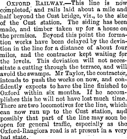 Oxford Eailway.—This line is now completed, and rails laid about a mile and half beyond the Oust bridge, viz., to the site of the Oust station. The siding has been made, and timber taken up for a house on the premises. Beyond this point the formation works have been delayed by the deviation in the line for a distance of about four miles, and the contractor kept waiting for the levels. This deviation will not necessitate a cutting through the terrace, and will avoid the swamps. Mr Taylor, the contractor, intends to push the works on now, and confidently expects to have the line finished to Oxford within six months. If he accomplishes this he will not have lost much time. There are two locomotives for the line, which can now run up to the Oust station, and possibly that part of the line may soon be open for general traffic, especially as the Oxford-Rangiora road is at present in a very bad state.