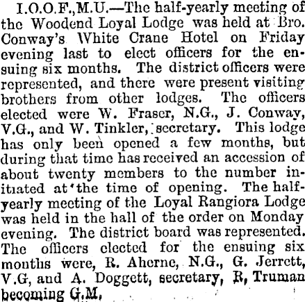 1.0.0.F..M.U. —The half-yearly meeting of the Woodend Loyal Lodge was held at Bro. Conway's White Crane Hotel on Friday evening last to elect officers for the ensuing six months. The district officers were represented, and there were present visiting brothers from other lodges. The officers elected were W. Frascr, N.G., J. Conway, V.G., and W. Tinkler,." secretary. This lodge has only been opened a few months, but during that time has received an accession of about twenty members to the number initiated at'the time of opening. The halfyearly meeting of the Loyal Rangiora Lodge was held in the hall of the order on Monday evening. The district board was represented. The officers elected for the ensuing six months were, R. Aherne, N.G., G. .Terrett, V.G, aud A. Doggett, secretary, R, Truman becoming QM,