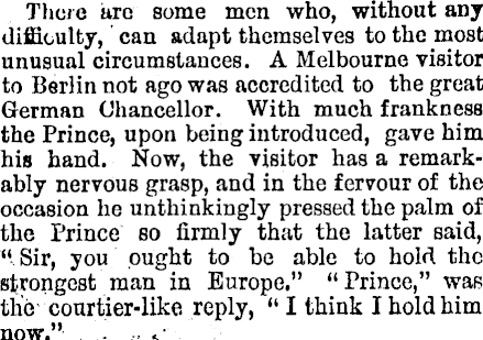There arc some men who, without any difficulty, can adapt themselves to the most unusual circumstances. A Melbourne visitor to Berlin not ago was accredited to the great German Chancellor. With much frankness the Prince, upon being introduced, gave him his hand. Now, the visitor has a remarkably nervous grasp, and in the fervour of the occasion he unthinkingly pressed the palm of the Prince so firmly that the latter said, "Sir, you ought to be able to hold the strongest man in Europe." " Prince," was the courtier-like reply, " I think I hold him now."