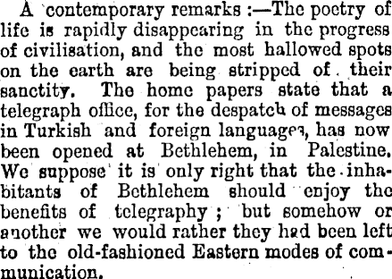 A contemporary remarks :—The poetry of life is rapidly disappearing in the progress of civilisation, and the most hallowed spots on the earth are being stripped of their sanctity. The home papers state that a telegraph office, for the despatch of messages in Turkish and foreign languages, has now been opened at Bethlehem, in Palestine. We suppose it is only right that the • inhabitants of Bethlehem should enjoy the benefits of telegraphy ; but somehow or another we would rather they had been left to the old-fashioned Eastern modes of communication.