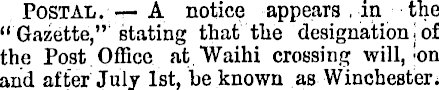 Postal. A notice appears in the "Gazette," stating that the designation of the Post Office at Waihi crossing will, ; on and after July Ist, be known as Winchester.