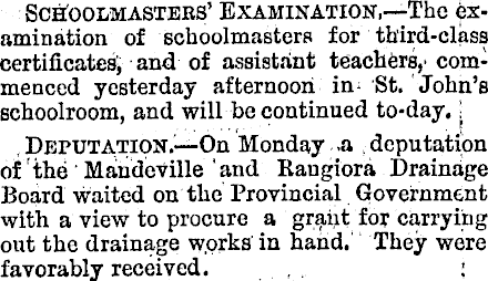 Schoolmasters' Examination,—The examination of schoolmasters for third-class certificates, and of assistant teachers, commenced yesterday afternoon in St. John's schoolroom, and will be continued to-day. Deputation.—On Monday a deputation of the Mandeville and Rangiora Drainage Board waited on the Provincial Government with a view to procure a grant for carrying out the drainage works in hand. They were favorably received. l