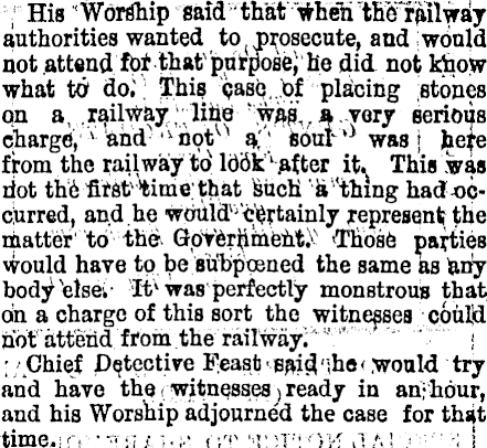 His Worship said that whrath¥r£ilway authorities wanted to, Mosecute, and would not attend for that 'purpose; he did not know what t 6 do.' This gase. of placing atones qn a. railway..line 'wag,, a very serious charge, v and' ,v not v a;; sour ,} was ; from the railway to" l<i6k l after it. This was riot the first-time; that such a 'thing had-oc-curred, and.he represent the. matter to ther Government;'- 'Those parties would have to be subpoened the same as any body'else. It v was perfectly monstrous that on a charge of this sort the witnesses could, riot attend from the railway. Chief Detective Feast said'he would try and have the witnesses >ready in anihour, and his Worship adjourne'd the case for that itime.m :-••:]/,;■,•■ i>T M"."l : : »;. d M