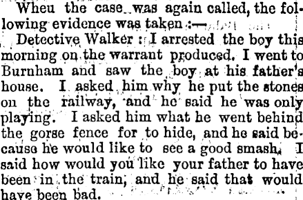 Wheu the case. was again called, the following evidence was taken : :-r- . Detective Walker ; I arrested the boy thjs morning on the warrant produced. I went to Burnham and saw the , boy at his father's house. I asked. him why he put the stones on the railway, -and ho said he was only playing. I asked him what he went behind the gorse fence for to hide, and he said because he would like to see a good smash. I said how would you like your father to have been in the train, and he said that would have been bad.