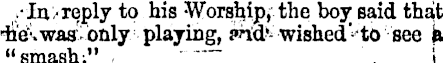 •In reply to his Worship, the boy said that -he'-,was only playing, ma? wished"--to see a "smash;"