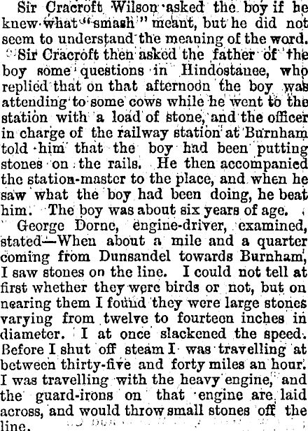 Sir Cracroft. Wilson-asked the boy if he knew-'what "-smauh " raelant, but he did not seem to understand the meaning of the word. Sir Cracroft then asked the father of the boy some ; questions in Hindostanee, whp replied that on that afternodn the boy was attending'to some cows while he went to the station with a load of stone, and the officer in charge of the railway station at Bu'rnham told -him' that the boy had been putting stones on the rails. He then accompanied the station-master to the place, and when he saw what the boy had been doing, he beat him. The boy was about six years of age. George Dome, engine-driver, examined, stated- 1 -When about a mile and a quarter coming from Dunsandel towards I saw stones on the line. I could not tell at first whether they were birds or not, but on nearing them I found they were large stones varying from twelve to fourteen inches in diameter. I at once slackened the speed. Before I shut off steam I was travelling at between thirty-five and forty miles an hont. I was travelling with the heavy engine, and the guard-irons on that engine aTe. laid across, and would throw small stones off the line. - '"■''