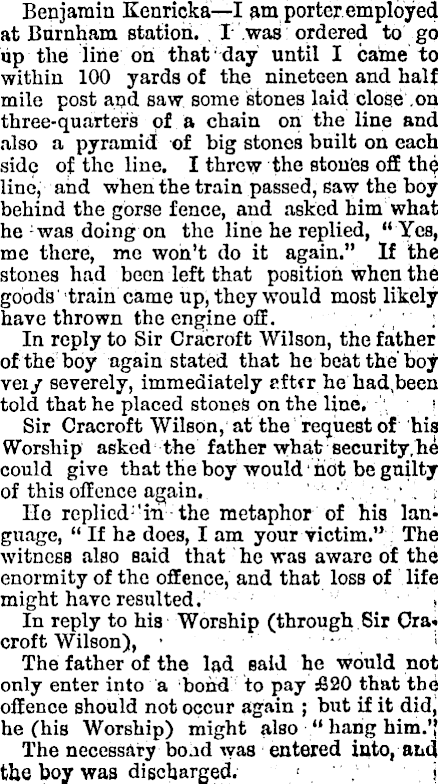 Benjamin Kenricka—l am porter employed at Burnham station. I was ordered to go up the line on that day until I came to within 100 yards of the nineteen and half mile post and saw some stones laid close on three-quarters of a chain on the line and also a pyramid of big stones built on each side of the line. I threw the stones off the line, and when the train passed, saw the boy behind the gorse fence, and asked him what he was doing on the line he replied, " Yes, me there, me won't do it again." If the stones had been left that position when the goods train came up, they would most likely have thrown the engine off. ; In reply to Sir Cracroft Wilson, the father of the boy again stated that he beat the' boy vei/ severely, immediately ?.ftfr he had.been told that he placed stones on the line. Sir Cracroft Wilson, at the request of his Worship asked the father what security, he could give that the boy would hot be guilty of this offence again. Ho replied 'in the metaphor of his language, "If he does, lam your victim." The witness also said that he was aware of the enormity of the offence, and that loss of life might have resulted. i In reply to his Worship (through Sir Cra« croft Wilson), The father of the lad said he would not only enter into a bond to pay £2O that the offence should not occur again ; but if it did, he (bis Worship) might also " hang him.'! The necessary bo-id was entered into, and the boy was discharged. j
