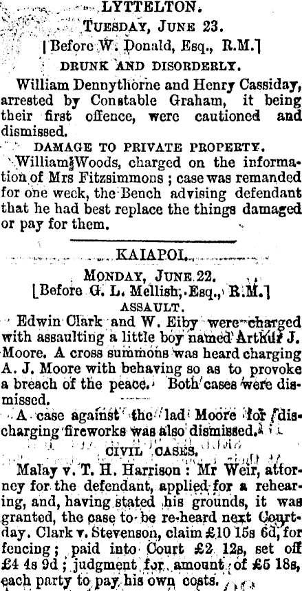 ' LYTTBLTON. 1. Tuesday, June 23. | Before W. Donald, Esq., R-M-l DRUNK AND DISORDERLY. William Dennythbrhe and Henrj Cassiday, arrested by Constable Graham, it being their first offence, were cautioned and dismissed. DAMAGE TO PRIVATE PROPERTY. WilliamJWoods, charged on the information of Mrs Fitzsimmons ; case was remanded for one week, the Bench advising defendant that he had best replace the things damaged or pay for them. . ". KAIAEOI. , - Monday, June 22. (.Before G. L, Mellish,.Esq., R.M.] ASSAULT. Edwin Clark and W. Eiby were-charged with assaulting a little boy natneftArtMir J. •Moore. A cross summons was heard charging A. J. Moore with behaving so as to provoke a breach of the peace.' Both cases were dismissed. - A case against the lad; Moore foi discharging fireworks was also dismissed, i CIVIL '.OASES. Malay v. T. H. Harrison : Mr Weir, attorney for the defendant, applied; for a rehearing, and, having stated his grounds, it was granted, the pase to- be re-heard next Cou/t----day. Clark v. Stevenson, claim £lolss 6dJfor fencing; paid into Court £2 12b, set off £4 4s 9d ; judgment for amount of £5 18s, party to pay hia own costs. ',', * ,