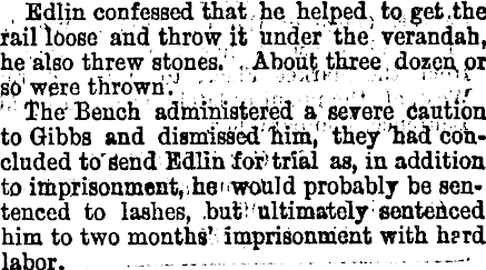 Edlin confessed that he. helped tq : get .the rail loose and throw it under the verandah, he also threw stones. About three. dozen, pi so'were thrown.' ' . ' ' , . .'»■ ' The Bench administered a /severe caution toGibbs and dismissed him, ! they liad cohcluded to send Edlin for'trial as, in addition to imprisonment, he would probably be sentenced to lashes, but 1 ultimately sentenced him to two months' imprisonment with herd labor.