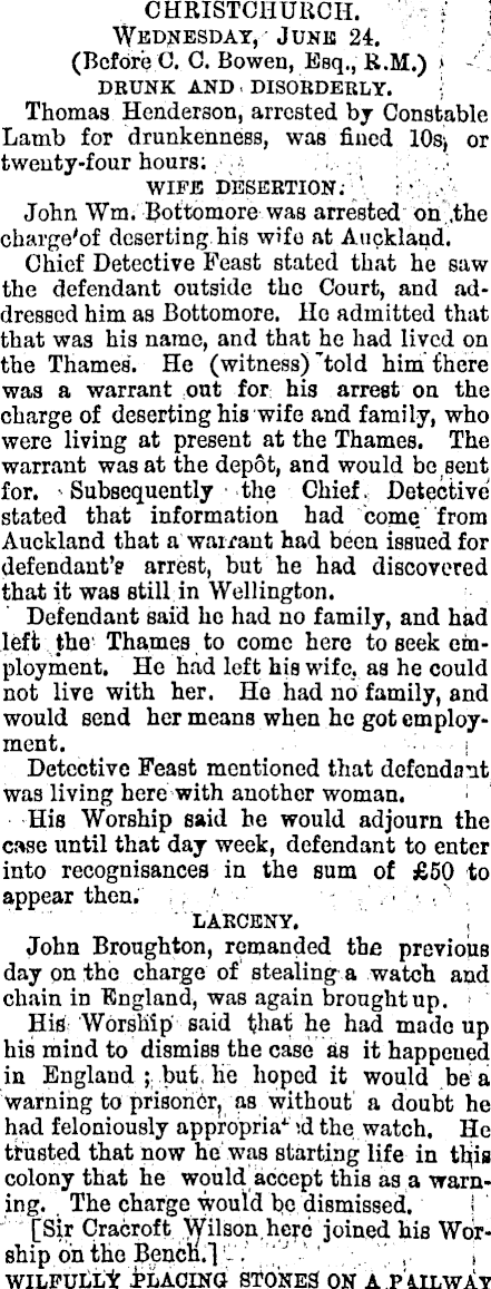 CHRISTGHUKCH. 2 Wednesday, Junk 24. (Before G. C. Bowen, Esq., R.M.) i DRUNK AND DISORDERLY. Thomas Henderson, arrested by Constable Lamb for drunkenness, was fined lOsj or twenty-four hours; WIFE DESERTION. ' John Wm, Bottomore was arrested on the charge'of deserting his wife at Auckland. Chief Detective Feast stated that he saw the defendant outside the Court, and addressed him as Bottomore. Ho admitted that that was his name, and that he had lived on the Thames. He (witness) "told him there was a warrant out for his arrest on the charge of deserting his wife and family, who were living at present at the Thames. The warrant was at the depot, and would be sent for. Subsequently the Chief Detective stated that information had come, from Auckland that a warrant had been issued for defendant'? arrest, but he had discovered that it was still in Wellington. Defendant said he had no family, and had left the Thames to come here to seek employment. Ho had left his wife, as he could not live with her. He had no family, and would send her means when he got employment. Detective Feast mentioned that defendant was living here with another woman. His Worship said he would adjourn the case until that day week, defendant to enter into recognisances in the sum of £SO to appear then. ; • ' LARCENY. John Broughton, remanded the previous day on the charge of stealing a watch and chain in England, was again brought up. His Worship said that he had made up his mind to dismiss the case as it happened in England ; but he hoped it would be a warning to prisoner, as without a doubt he had feloniously appropria' - «.d the watch. He trusted that now he was starting life in this colony that he would accept this as a warning. The charge would he dismissed. [Sir Cracroft \yilson here joined his Worship on the Bench.! . WILFULLY, PLACING STONES ON A P iILWAY