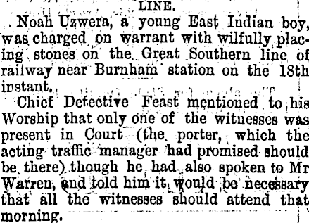 . Noah Uzwera, a young East Indian boy, was charged, |on warrant with wilfully.placing stones oh the. Great Southern line of railway near Burnharh' station oh the 18th instants ~-. ... ~, •, .. , r ■ •<•. j Chief Detective Feast mentioned to, his Worship that only one of the witnesses was present in Court" (the porter, which the acting traffic manager had promised should be.there), though he. had,also spoken to Mr •Warren, told himit^oujd "i-be necessary that all the witnesses'should attend that morning.