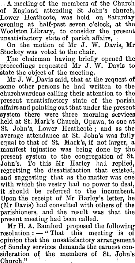A meeting of the members of the Church of England attending St John's churchy Lower Heathcote, was held on Saturday evening at half-past seven o'clock, at the Woolston Library, to consider the present unsatisfactory state of parish affairs. On the motion of Mr J. W. Davis, Mr Stuckey was voted to the chair. The chairman having briefly opened the proceedings requested Mr J. W. Davis to state the object of the meeting. Mr J. W. Davis said, that at the request of some other persons he had written to the churchwardens calling their attention to the present unsatisfactory state of the parish affairs and pointing out that under the present system there were three morning services held at St. Mark's Church, Opawa, to one at St. John's, Lower Heathcote ; and as the average attendance at St. John's was fully equal to that of St. Mark's, if not larger, a manifest injustice was being done by the present system to the congregation of St. John's. To this Mr Harley hal replied, regretting the dissatisfaction that existed, and suggesting that as the matter was one with which the vestry had no power to deal, it should be referred to the incumbent. , Upon the receipt of Mr Harlcy's letter, he (Mr Davis) had consulted with others of the parishioners, and the result was that the present meeting had been called. Mr H. A. Bamford proposed the following resolution : " That this meeting is of opinion that the unsatisfactory arrangement of Sunday services demands the earnest consideration of the members of St. John's Church."