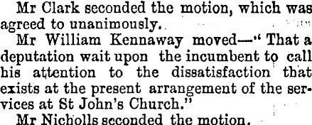Mr Clark seconded the motion, which was agreed to unanimously. Mr William Kennaway moved—•' That a deputation wait upon the incumbent to call his attention to the dissatisfaction that exists at the present arrangement of the services at St John's Church." Mr Nicholls seconded the motion.