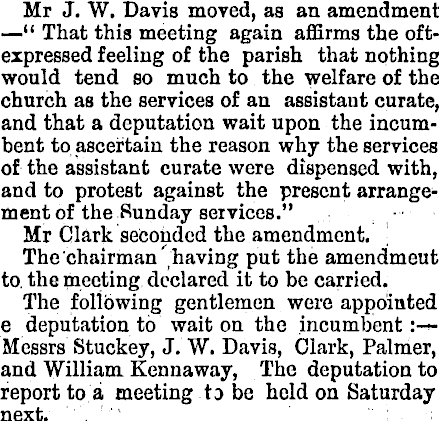 Mr J. W. Davis moved, as an amendment —" That this meeting again affirms the oftexpressed feeling of the parish that nothing would tend so much to the welfare of the church as the services of an assistant curate, and that a deputation wait upon the incumbent to ascertain the reason why the services of the assistant curate were dispensed with, and to protest against the present arrangement of the Sunday services." Mr Clark seconded the amendment. The chairman having put the amendmeut to the meeting declared it to be carried. The following gentlemen were appointed e deputation to wait on the incumbent:— Messrs Stuckey, J. W. Davis, Clark, Palmer, and William Kennaway, The deputation to report to a meeting to be held on Saturday next.