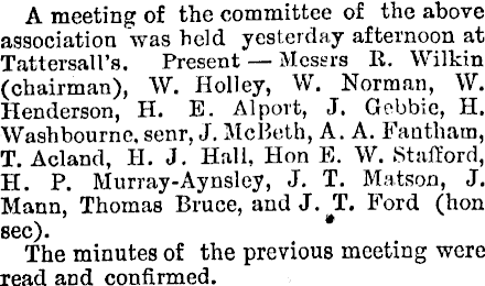 A meeting of the committee of the above association was held yesterday afternoon at Tattersall’s. Present Messrs R. Wilkin (chairman), W. Holley, W. Norman, W. Henderson, H. E. Alport, J. Gebbic, H. Washbourne. senr, J. Mcßeth, A. A. Fautham, T. Acland, H. J. Hall, Hon E. W. Stafford, H. P. Murray-Aynsloy, J. T. Matson, J, Mann, Thomas Bruce, and J. T. Ford (hon sec). The minutes of the previous meeting were read and confirmed.