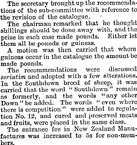 The secretary brought up the recommendations of the sub-committee with reference to the revision of the catalogue. The chairman remarked that he thought shillings should be done away with, and the prize in each case made pounds. Either let them all be pounds or guineas. A motion was then carried that where guineas occur in the catalogue the amount be made pounds. The recommendations were discussed seriatim and adopted with a few alterations. In the Southdown breed of sheep, it was carried that the word “ Southdown ” remain as formerly, and the words “ any other Down ”be added. The words “ even where there is competition ” were added to regulation No, 12, and cured and preserved meats and fruits, were placed in the same class. The entrance fee in New Zealand Manufactures was increased to 5s for non-mem-bers.