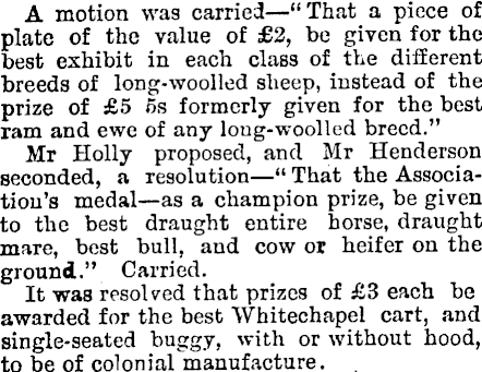 A motion was carried—“ That a piece of plate of the value of £2, be given for the best exhibit in each class of the different breeds of long-woolled sheep, instead of the prize of £5 5s formerly given for the best ram and ewe of any long-woolled breed.” Mr Holly proposed, and Mr Henderson seconded, a resolution —“ That the Association’s medal —as a champion prize, be given to the best draught entire horse, draught mare, best bull, and cow or heifer on the ground.” Carried. It was resolved that prizes of £3 each be awarded for the best Whitechapel cart, and single-seated buggy, with or without hood, to be of colonial manufacture.