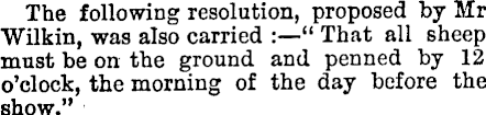 The following resolution, proposed by Mr Wilkin, was also carried : —“ That all sheep must be on the ground and penned by 12 o’clock, the morning of the day before the show.”