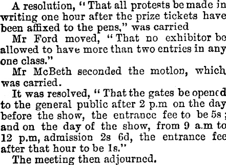 A resolution, “ That all protests be made in writing one hour after the prize tickets have been affixed to the pens,” was carried Mr Ford moved, “ That no exhibitor be allowed to have more than two entries in any one class.” Mr Mcßeth seconded the motion, which was carried. It was resolved, “ That the gates be opened to the general public after 2 p.m on the day before the show, the entrance fee to be 5s ; and on the day of the show, from 9 a.m to 12 p.m, admission 2s 6d, the entrance fee after that hour to be Is.” The meeting then adjourned.