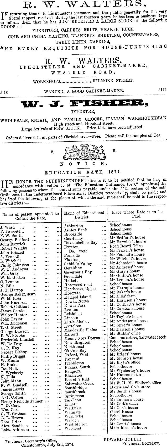 E. W. WALTEES, IN returning thanks to his numerous customers and the public generally for the very liberal support received during the last fourteen years he has been in business, begs to inform them that he has JUST RECEIVED A LARGE STOCK of the following GOODS :- FURNITURE) CARPETS, FELTS, HEARTH RUGS, COIR AND CHINA MATTING, BLANKETS, SHEETING, COUNTERPANES, TABLE LINEN, NAPKINS, A ND EVERY REQUISITE FOR H 0 U S E-F URNI SH IN G R. W. WALTERS, UPHOLSTERER AND CABINET-MAKER, WHATELY ROAD. WORKSHOPS KILMORE STREET. 513 WANTED, A GOOD CABINET-MAKER. 5144 IMPORTER, WHOLESALE, RETAIL, AND FAMILY GROCER, ITALIAN WAREHOUSEMAN High street and Hereford street. Large Arrivals of NEW STOCK. Price Lists have been adjusted. Orders delivered in all parts of Christchurch-Free. Please call for samples of Tea. 0 E . EDUCATION RATE, 1874. TS HONOR THE SUPERINTENDENT directs it to be notified that he has, in accordance with section 56 of 'The Education Ordinance, 1873," appointed the following persons to whom the annual sums payable under the 65th section of the said Ordinance; in the undermentioned Educational Districts respectively, shall be paid , and has fixed the following as the places at which the said sums shall be paid in the respective districts: — Name of person appointed to Collect the Rate. J.Ward P. Fawcett F.W.Smith George Bedford John Barwick Robert Wright John Frizzell A. Fennall L. Witchell Philip Johnston W. 0: Andrews Wm. Gray W. H. Gorton C. Lennox N.Ellis J. T. Harrop George Baker, senr W. M. Ross John Harrison Robert Colthart James Carston Walter Hunter John Taylor Wm. Anderson T. G. Street George Dawson F. W. Stubbs Frederick Linsdell W. De Troy G.P.Kay George Bishop Philip Briggs W. Munro H. Brake Jas. Hutt T. Wycherly N.Ellis John Mann F. W. Lindsell James Lewis George Smith J.G.Cotton Henry Nicliolls Tanner T.G.Cork Wm. Cox G.H.Graham L. L. Brown Thos. Prior Alex. Sandison liobt. Atkinson Name of Educational Place where Rate is to be District. Paid. Ashburton Ashley Bank Brookside Courtenay Duvauchelle's Bay . Eyreton Do. west Fernside Flaxton Gebbie's Valley Geraldine Governor's Bay Greendale Halkett Harewood road Heathcote, Upper Hororata Kaiapoi Island Kowai, North Kowai Pass Leeston Leithfield Lincoln Little Akaloa Lyttelton Mandeville Plains . Milford Mount Grey Downs . New Brighton North road Okain's Bay Oxford, West Papanui Prebbleton Rakaia, South Rangiora Riccarton Russell's Flat Saltwater Creek Southbridge Southbrook Springston Tai-Tapu Timaru "Waimate Washdyke Weedcn West Melton Woodcud .. Schoolhojse .. Schoolhouse .. Schoolhouse .. Mr Bedford's house .. Mr Barwick's house .. Road Board Office .. Mr Frizzell's house .. Mr Fennall's house .. Mr Witchell's house .. Mr Johnston's house .. Mr Andrews' house .. Mr Gray's house .. Mr Gorton's house .. Mr Lennox's house .. Schoolhouse .. Mr Harrop's house .. Mr Baker's house .. Mr Ellis'farm .. Mr Harrison's house .. Mr Colthart's house .. Mr Carston's house .. Schoolhouse .. Mr Taylor's house .. Mr Anderson's house .. Mr Street's house . Mr Dawson's house .. Mr Stubbs' office .. Cameron's store, Saltwater creek .. Schoolhouse .. Schoolhouse .. Schoolhouse .. Mr Briggs' house .. Mr Munro's house ... Mr Blyth's office .. Schoolhouse .. Mr Wycherley's house .. Mr Hanson's store .. Schoolhouse .. Mr F. H. M. Walker's office .. Harris and Co.'s store ... Mr Smith's house ... Schoolhouse .. Mr Tanner's house .. Mr Cork's office .. Mr Cox's house .. Court House .. Schoolhouse .. Schoolhouse .. Mr Contts' house ... Mr Atkinson's house Provincial Secretary's Office, Christchurch, July 3rd, 1874. EDWARD JOLLIE Provincial Secretary.