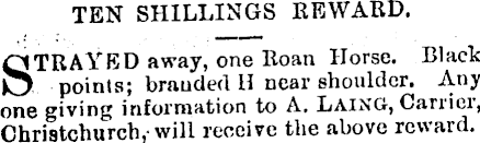 TEN SHILLINGS REWARD. 'STRAYED away, one Roan Horse. Black _J points; branded H near shoulder. Any one giving information to A. LAING, Carrier, Christchurch, will receive the above reward.
