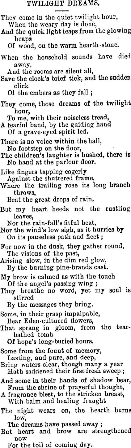 TWILIGHT DREAMS. They come in the quiet twilight hour, When the weary day is done, And the quick light leaps from the glowing heaps Of wood, on the warm hearth-stone. When the household sounds hare died away, And the rooms are silent all, Save the clock's brief tick, and the sudden click Of the embers as they fall; They come, those dreams of the twilight hour, To me, with their noiseless tread, A tearful band, by the guiding hand Of a grave-eyed spirit led. There is no voice within the hall, No footstep on the floor, The children's laughter is hushed, there is No hand at the parlour door. Like fingers tapping eagerly Against the shuttered frame, Where the trailing rose its long branch throws, Beat the great drops of rain. But my heart heeds not the rustling leaves, Nor the rain-fall's fitful beat, Nor the wind's low sigh, as it hurries by On its pauseless path and fleet ; For now in the dusk, they gather round, The visions of the past, Arising slow, in the dim red glow, By the burning pine-brands cast. My brow is calmed as with the touch Of the angel's passing wing ; They breathe no word, yet my soul is stirred By the messages they bring. Some, in their grasp impalpable, Bear Eden-cultured flowers, That sprang in gloom, from the tearbathed tomb Of hope's long-buried hours. Some from the fount of memory, Lasting, and pure, and deep, Bring waters clear, though many a year Hath saddened their first fresh sweep ; And some in their hands of shadow bear, From the shrine of prayerful thought, A fragrance blest, to the stricken breast, With balm and healing fraught The night wears on, the hearth burns low, The dreams have passed away ; But heart and brow are strengthened now For the toil of coming day.