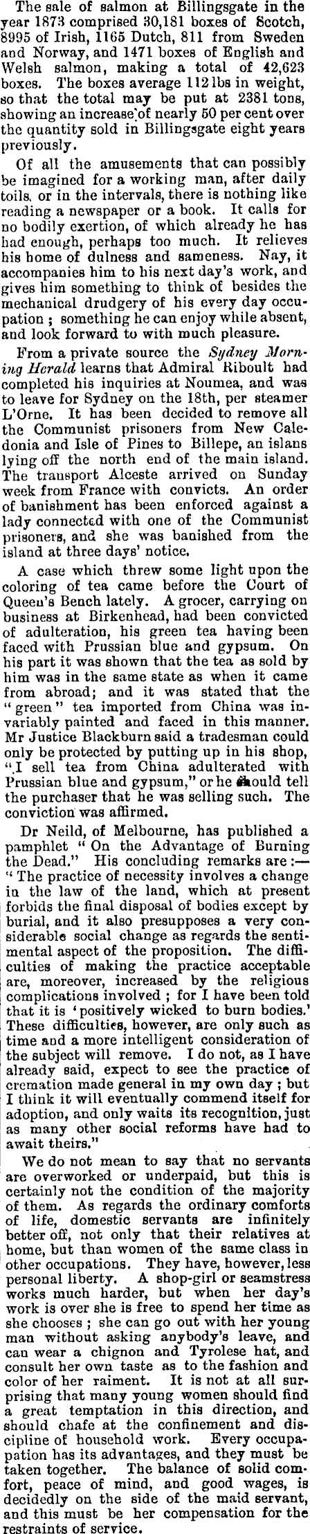 The sale of salmon at Billingsgate in the year 1873 comprised 30,181 boxes of Scotch, 8995 of Irish, 1165 Dutch, 811 from Sweden and Norway, and 1471 boxes of English and Welsh salmon, making a total of 42,623 boxes. The boxes average 112 lbs in weight, so that the total may be put at 2381 tons, showing an increase]of nearly 50 per cent over the quantity sold in Billingsgate eight years previously. Of all the amusements that can possibly be imagined for a working man, after daily toils, or in the intervals, there is nothing like reading a newspaper or a book. It calls for no bodily exertion, of which already he has had enough, perhaps too much. It relieves his home of dulness and sameness. Nay, it accompanies him to his next day's work, and gives him something to think of besides the mechanical drudgery of his every day occupation ; something he can enjoy while absent, and look forward to with much pleasure. From a private source the Sydney Morning Herald learns that Admiral Kiboult had completed his inquiries at Noumea, and was to leave for Sydney on the 18th, per steamer L'Orne. It has been decided to remove all the Communist prisoners from New Caledonia and Isle of Pines to Billepe, an islans lying off the north end of the main island. The transport Alceste arrived on Sunday week from France with convicts. An order of banishment has been enforced against a lady connected with one of the Communist prisoners, and she was banished from the island at three days' notice. A case which threw some light upon the coloring of tea came before the Court of Queen's Bench lately. A grocer, carrying on business at Birkenhead, had been convicted of adulteration, his green tea having been faced with Prussian blue and gypsum. On his part it was shown that the tea as sold by him was in the same state as when it came from abroad; and it was stated that the " green " tea imported from China was invariably painted and faced in this manner. Mr Justice Blackburn said a tradesman could only be protected by putting up in his shop, ".I sell tea from China adulterated with Prussian blue and gypsum," or he Ikould tell the purchaser that he was selling such. The conviction was affirmed. Dr Neild, of Melbourne, has published a pamphlet " On the Advantage of Burning the Dead." His concluding remarks are : " The practice of necessity involves a change in the law of the land, which at present forbids the final disposal of bodies except by burial, and it also presupposes a very considerable social change as regards the sentimental aspect of the proposition. The difficulties of making the practice acceptable are, moreover, increased by the religious complications involved ; for I have been told that it is ' positively wicked to burn bodies.' These difficulties, however, are only such as time and a more intelligent consideration of the subject will remove. Ido not, as I have already said, expect to see the practice of cremation made general in my own day ; but I think it will eventually commend itself for adoption, and only waits its recognition, just as many other social reforms have had to await theirs." We do not mean to say that no servants are overworked or underpaid, but this is certainly not the condition of the majority of them. As regards the ordinary comforts of life, domestic servants are infinitely better off, not only that their relatives at home, but than women of the same class in other occupations. They have, however, less personal liberty. A shop-girl or seamstress works much harder, but when her day's work is over she is free to spend her time as she chooses ; she can go out with her young man without asking anybody's leave, and can wear a chignon and Tyrolese hat, and consult her own taste as to the fashion and color of her raiment. It is not at all surprising that many young women should find a great temptation in this direction, and should chafe at the confinement and discipline of household work. Every occupapation has its advantages, and they must be taken together. The balance of solid comfort, peace of mind, and good wages, is decidedly on the side of the maid servant, and this must be her compensation for the restraints of service.