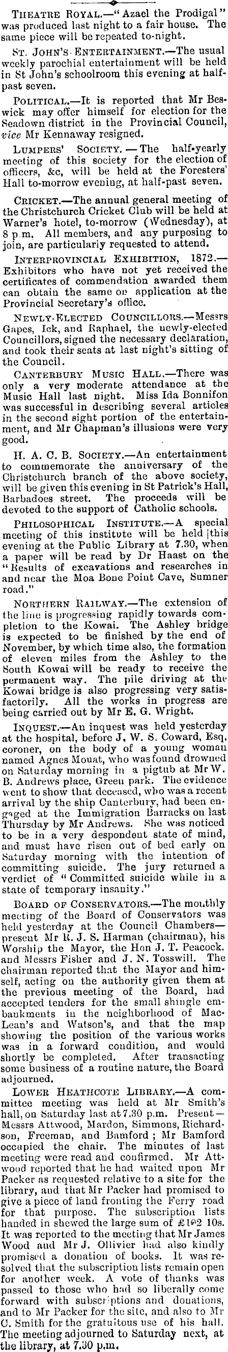o Theatre Royal.—" Azael the Prodigal" was produced last night to a fair house. The same piece will be repeated to-night. St. John's Entertainment.—The usual weekly parochial entertainment will be held in St John's schoolroom this evening at halfpast seven. Political.—lt is reported that Mr Beswick may offer himself for election for the Seadown district ia the Provincial Council, vice Mr Kennaway resigned. Lumpers' Society. The half-yearly meeting of this society for the election of officers, &c, will be held at the Foresters' Hall to-morrow eveniug, at half-past seven. Cricket. —The annual general meeting of the Christchurch Cricket Club will be held at Warner's hotel, to-morrow (Wednesday), at 8 p.m. All members, and any purposing to join, are particularly requested to attend. Interprovincial Exhibition, 1872. — Exhibitors who have not yet received the certificates of commendation awarded them can obtain the same on application at the Provincial Secretary's office. Newly-Elected Councillors.—Messrs Gapes, Ick, and Raphael, the uewly-elected Councillors, signed the necessary declaration, and took their seats at last night's sitting of the Council. Canterbury Music Hall. —There was only a very moderate attendance at the Music Hall last night. Miss Ida Bonnifon was successful in describing several articles in the second sight portion of the entertainment, and Mr Chapman's illusions were very good. H. A. C. B. Society.—An entertainment to commemorate the anniversary of the Christchurch branch of the above society, will be given this evening in St Patrick's Hall, Barbadoes street. The proceeds will be devoted to the support of Catholic schools. Philosophical Institute.—A special meeting of this institute will be held jthis evening at the Public Library at 7.30, when a paper will be read by Dr Haast on the " Results of excavations and researches in and near the Moa Bone Point Cave, Sumner road." Northern Railway.—The extension of the line is progressing rapidly towards completion to the Kowai. The Ashley bridge is expected to be finished by the end of November, by which time also, the formation of eleven miles from the Ashley to the South Kowai will be ready to receive the permanent way. The pile driving at the Kowai bridge is also progressing very satisfactorily. All the works in progress are being carried out by Mr E. G. Wright. Inquest.—An inquest was held yesterday at the hospital, before J, W. S. Coward, Esq, coroner, on the body of a young woman named Agnes Mouat, who was found drowned on Saturday morning in a pigtub at MrW. B. Andrews place, Green park. The evidence went to show that deceased, who was a recent arrival by the ship Canterbury, had been engaged at the Immigration Barracks on last Thursday by Mr Andrews. She was noticed to be in a very despondent state of mind, and must have risen out of bed early on Saturday morning with the intention of committing suicide. The jury returned a verdict of " Committed suicide while in a state of temporary insanity." Board op Conservators.—The monthly meeting of the Board of Conservators was held yesterday at the Council Chamberspresent Mr R. J. S. Harman (chairman), his Worship the Mayor, the Hnn J. T. Peacock, and Messrs Fisher and J. N. Tosswill. The chairman reported that the Mayor and himself, acting on the authority given them at the previous meeting of the Board, had accepted tenders for the small shingle embankments in the neighborhood of MacLean's and Watson's, and that the map showing the position of the various works was in a forward condition, and would shortly be completed. After transacting some business of a routine nature, the Board adjourned. Lower Heathcote Library.—A committee meeting was held at Mr Smith's hall, on Saturday last at 7.30 p.m. Present Messrs Attwood, Mardon, Simmons, Richardson, Freeman, and Bamford ; Mr Bamfoid occupied the chair. The minutes of last meeting were read and confirmed. Mr Attwood reported that he had waited upon Mr Packer as requested relative to a site for the library, and that Mr Packer had promised to give a piece of land fronting the Ferry road for that purpose. The subscription lists handed in shewed the large sum of It was reported to the meeting that Mr James Wood and Mr J. Ollivier had also kindly promised a donation of books. It was resolved that the subscription lists remain open for another week. A vote of thanks was passed to those who had so liberally come forward with subscriptions arid donations, and to Mr Packer for the site, and also to Mr C. Smith for the gratuitous use of his hall. The meeting adjourned to Saturday next, at the library, at 7.30 u.in.