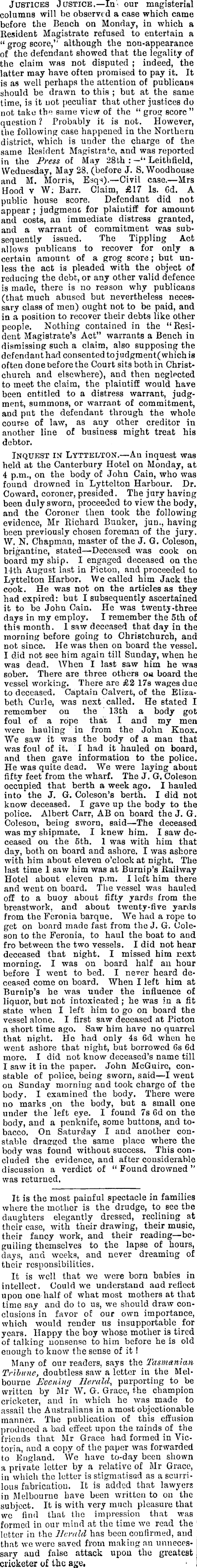Justices Justice. —In our magisterial columns will be observed a case which came before the Bench on Monday, in which a Resident Magistrate refused to entertain a " grog score," although the non-appearance of the defendant showed that the legality of the claim was not disputed ; indeed, the latter may have often promised to pay it. It is as well perhaps the attention of publicans should be drawn to this ; but at the same time, is it not peculiar that other justices do not take the same view of the " grog score " question 1 Probably it is not. However, the following case happened in the Northern district, which is under the charge of the same Resident Magistrate, and was reported in the Press ol May 28th : -'• Leithfield, Wednesday, May 28, (before J. S. Woodhouse and M. Morris, Eaqs).—Civil case.—Mrs Hood v W; Barr. Claim, £l7 Is. Cd. A public house score. Defendant did not appear ; judgmenc for plaiutiff for amount and costs, an immediate distress granted, and a warrant of commitment was subsequently issued. The Tippling Act allows publicans to recover for only a certain amount of a grog score ; but unless the act is pleaded with the object of reducing the debt, or any other valid defence is made, there is no reason why publicans (that much abused but nevertheless necessary class of men) ought not to be paid, and in a position to recover their debts like other people. Nothing contained in the "Resident Magistrate's Act" warrants a Bench in dismissing such a claim, also supposing the defendant had consented to j udgment( which is often done before the Court sits both in Christchurch and elsewhere), and then neglected to meet the claim, the plaintiff would have been entitled to a distress warrant, judgment, summons, or warrant of commitment, and put the defendant through the whole course of law, as any other creditor in another line of business might treat his debtor. Inquest in Lyttelton.—An inquest was held at the Canterbury Hotel on Monday, at 4 p.m., on the body of John Cain, who was found drowned in Lyttelton Harbour. Dr. Coward, coroner, presided. The jury having been duly sworn, proceeded to view the body, and the Coroner then took the following evidence, Mr Richard Bunker, jun., having been previously chosen foreman of the jury. W. N. Chapman, master of the J. G. Coleson, brigantine, stated —Deceased was cook on board my ship. I engaged deceased on the 14th August last in Picton, and proceeded to Lyttelton Harbor. We called him Jack the cook. He was not on the articles as they had expired: but I subsequently ascertained it to be John Cain. He was twenty-three days in my employ. I remember the sth of this month. I saw deceased that day in the morning before going to Christchurch, and not since. He was then on board the vessel. I did not see him again till Sunday, when he was dead. When I last saw him he was sober. There are three others ou board the vessel working. There are £2 17s wages due to deceased. Captain Calvert, of the Elizabeth Curie, was next called. He stated I remember on the 13th a body got foul of a rope that I and my men were hauling in from the John Knox. We saw it was the body of a man that was foul of it. I had it hauled on board, and then gave information to the police. He was quite dead. We were laying about fifty feet from the wharf. The J. G. Coleson occupied that berth a week ago. I hauled into the J. G. Coleson's berth. I did not know deceased. I gave up the body to the police. Albert Carr, AB on board the J. G. Coleson, being sworn, said—The deceased was my shipmate. I knew him. I saw deceased on the sth. 1 was with him that day, both on board and ashore. I was ashore with him about eleven o'clock at night. The last time 1 saw him was at Burnip's Railway Hotel about eleven p.m. I left him there and went on board. The vessel was hauled off to a buoy about fifty yards from the breastwork, and about twenty-five yards from the Feronia barque. We had a rope to get on board made fast from the J. G. Coleson to the Feronia, to haul the boat to and fro between the two vessels. I did not hear deceased that night. I missed him next morning. I was on board half an hour before I went to bed. I never heard deceased come on board. When I left him at Burnip's he was under the influence of liquor, but not intoxicated; he was in a fit state when I left him to go on board the vessel alone. I first saw deceased at Picton a short time ago. Saw him have no quarrel that night. He had only 4s 6d when he went ashore that night, but borrowed 6s 6d more. I did not know deceased's name till I saw it in the paper. John McGuire, constable of police, being sworn, said —I went on Sunday morning and took charge of the body. I examined the body. There were no marks .on the body, but a small one under the left eye. I found 7s 6d on the body, and a penknife, some buttons, and tobacco. On Saturday I and another constable draerged the same place where the body was found without success. This concluded the evidence, and after considerable discussion a verdict of " Found drowned " was returned. It is the most painful spectacle in families where the mother is the drudge, to see the daughters elegantly dressed, reclining at their ease, with their drawing, their music, their fancy work, and their reading—beguiling themselves to the lapse of hours, days, and weeks, and never dreaming of their responsibilities. It is well that we were born babies in intellect. Could we understand and reflect upon one half of what most mothers at that time say and do to us, we should draw conclusions in favor of our own importance, which would render us insupportable for years. Happy the boy whose mother is tired of talking nonsense to him before he is old enough to know the sense of it ! Many of our readers, says the Tasmanian Tribune, doubtless saw a letter in the Melbourne Evening Herald, purporting to be written by Mr W. G. Grace, the champion cricketer, and in which he was made to assail the A