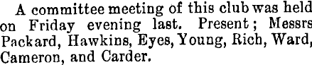 A committee meeting of this club was held on Friday evening last. Present; Messrs Packard, Hawkins, Eyes, Young, Rich, Ward, Cameron, and Carder.