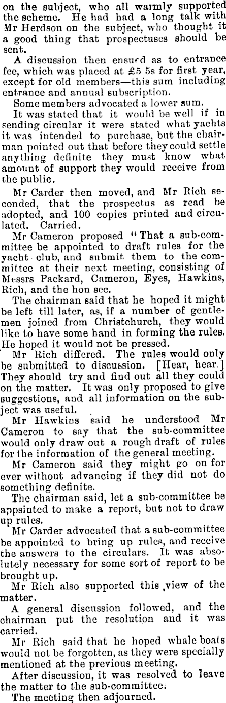 on the subject, who all warmly supported the scheme. He had had a long talk with Mr Herdson on the subject, who thought it a good thing that prospectuses should be sent. A discussion then ensurd as to entrance fee, which was placed at £5 5s for first year, except for old members—this sum including entrance and annual subscription. Some members advocated a lower sum. It was stated that it would be well if in sending circular it were stated what yachts it was intended to purchase, but the chairman pointed out that before they could settle anything definite they must know what amount of support they would receive from the public. Mr Carder then moved, and Mr Rich seconded, that the prospectus as read be adopted, and 100 copies printed and circulated. Carried. Mr Cameron proposed “ That a sub-cora-mittee be appointed to draft rules for the yacht club, and submit, them to the committee at their next meeting, consisting of Messrs Packard, Cameron, Eyes, Hawkins, Rich, and the hon sec. The chairman said that he hoped it might be left till later, as, if a number of gentlemen joined from Christchurch, they would like to have some hand in forming the rules. He hoped it would not be pressed. Mr Rich differed. The rules would only be submitted to discussion. [Hear, hear.] They should try and find out all they could on the matter. It was only proposed to give suggestions, and all information on the subject was useful. Mr Hawkins said he understood _ Mr Cameron to say that the sub-committee would only draw out a rough draft of rules for (he information of the general meeting. Mr Cameron said they might go on for ever without advancing if they did not do something definite. The chairman said, let a sub-committee be appsinted to make a report, but not to draw up rules. Mr Carder advocated that a sub-committee be appointed to bring up rules, and receive the answers to the circulars. It was absolutely necessary for some sort of report to be brought up. Mr Rich also supported this .view of the matter. A general discussion followed, and the chairman put the resolution and it was carried. Mr Rich said that ho hoped whale boals would not be forgotten, as they were specially mentioned at the previous meeting. After discussion, it was resolved to leave the matter to the sub-committee; The meeting then adjourned.