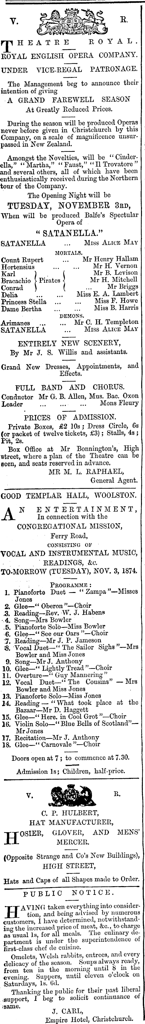 Y. E. rj! HEAT E E ROYAL. ROYAL ENGLISH OPERA COMPANY. UNDER VICE-REGAL PATRONAGE. The Management beg to announce their intention of giving A GRAND FAREWELL SEASON i At Greatly Reduced Prices. During the season will be produced Operas never before given in Christchurch by this Company, on a scale of magnilicen.ee unsurpassed in New Zealand. f Amongst the Novelties, will be “Cinderella,” “Martha,” “Faust,” “II Trovatore ” and several others, all of which have been enthusiastically received during the Northern j tour of the Company. The Opening Night will be TUESDAY, NOVEMBER 3bd, ■When will be produced Balfe’s Spectular Opera of “ SATANELLA..” SATANELLA ... Miss Alice May MORTALS. Count Rupert ... Mr Henry Hallam - Hortensius Mr H. Vernon Karl ) ( Mr B. Levison Bracachio > Pirates < Mr H. Mitchell Conrad ) ( ... Mr Briggs , Delia Miss E. A. Lambert Princess Stella Miss F. Howe Dame Bertha ... ... Miss B. Harris DEMONS. Arimanes ... ... Mr C. H. Templeton SATANELLA ... Miss Alice May ENTIRELY NEW SCENERY, By Mr J. S. Willis and assistants. Grand New Dresses, Appointments, and Effects. FULL BAND AND CHORUS. Conductor Mr G, B. Allen, Mus. Bac. Oxon Leader Mons Fleury . PRICES OF ADMISSION. Private Boxes, £2 10s ; Dress Circle, 6s (or packet of twelve tickets, £3); Stalls, 4s ; Pit, 2s. Box Office at Mr Bennington’s, High street, where a plan of the Theatre can be i Been, and seats reserved in advance, MR M. L. RAPHAEL, | General Agent. GOOD TEMPLAR HALL, WOOLSTON. ( AN ENTERTAINMENT, In connection with the CONGREGATIONAL MISSION, Ferry Road, CONSISTING OF VOCAL AND INSTRUMENTAL MUSIC, ' READINGS, &c. TO-MORROW (TUESDAY), NOV. 3, 1874, Programme : 1. Pianoforte Duet “Zampa”—Misses Jones 2, Glee—“ Oberon ’’—Choir ( 3. Reading—Rev. W. J. Habens 4. Song—Mrs Bowler ,5. Pianoforte Solo—Miss Bowler 6. Glee—“ See our Oars ” —Choir 7. Reading—Mr J. P. Jameson 8, Vocal Duet—“ The Sailor Sighs ”—Mrs I Bowler and Miss J ones 9. Song—Mr J. Anthony 10. Glee—“ Lightly Tread ” —Choir 11,. Overture—“ Guy Mannering” 12. Vocal Duet—“ The Cousins” Mrs Bowler and Miss Jones 13. Pianoforte Solo—Miss Jones 14. Reading Bazaar—Mr D. Haggett 15. Glee—“ Here, in Cool Grot ’’—Choir 16. Violin Solo—“ Blue Bells of Scotland”— ( Mr Jones 17. Recitation—Mr J. Anthony ' 18. Glee —“Camovale” —Choir Doors open at 7 ; to commence at 7.30. Admission Is; Children, half-price. V. R. H C. P. HULBERT, HAT MANUFACTURER, OSIER, GLOVER, AND MENS’ MERCER. (Opposite Strange and Co’s New Buildings), HIGH STREET, Hats and Caps of all Shapes made to Order. PUBLIC NOTICE. ’ AVING taken everything into eonsidertion, and being advised by numerous imers, 1 have determined, notwithstandae increased price of meat, &c., to charge ual Is, for all meals. The culinary denent is under the superintendence ot class chef de cuisine, iclcts, Welsh rabbits, entrees, and every acy of the season. Soups always ready, ten in the morning until 8 in the mg. Suppers, until eleven o’clock on rdays, Is. (id. lanking the public for their past liberal ort, I beg to solicit continuance of J. CARL, Empire Hotel, Christchurch.