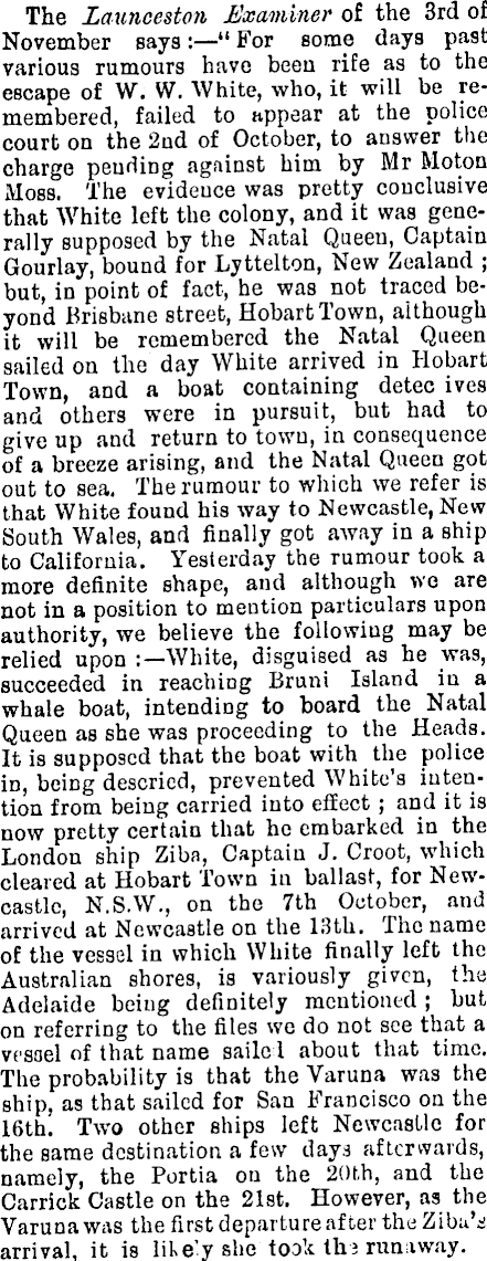 The Launceston Examiner of the 3rd of November says:—" For some days past various rumours have been rife as to the escape of W. W. White, who, it will be remembered, failed to appear at the police court on the 2nd of October, to auswer the charge pending against him by Mr Moton Moss. The evidence was pretty conclusive that White left the colony, and it was generally supposed by the Natal Queen, Captain Gourlay, bound for Lyttelton, New Zealand ; but, in point of fact, he was not traced beyond Brisbane street, Hobart Town, although it will be remembered the Natal Queen sailed on the day White arrived in Hobart Town, and a boat containing detec ives and others were in pursuit, but had to give up and return to town, in consequence of a breeze arising, and the Natal Queen got out to sea. The rumour to which we refer is that White found his way to Newcastle, New South Wales, and finally got away in a ship to California. Yesterday the rumour took a more definite shape, and although we are not in a position to mention particulars upon authority, we believe the following may be relied upon :—White, disguised as he was, succeeded in reaching Bruni Island in a whale boat, intending to board the Natal Queen as she was proceeding to the Heads. It is supposed that the boat with the police in, being descried, prevented White's intention from being carried into effect ; and it is now pretty certain that he embarked in the London ship Ziba, Captain J. Croot, which cleaved at Hobart Town in ballast, for Newcastle, N.S.W., on the 7th October, and arrived at Newcastle on the 13th. The name of the vessel in which White finally left the Australian shores, is variously given, the Adelaide being definitely mentioned; but on referring to the files we do not see that a vessel of that name sailcl about that time. The probability is that the Varuna was the ship, as that sailed for San Francisco on the 16th. Two other ships left Newcastle for the same destination a few days afterwards, namely, the Portia on the 20th, and the Carrick Castle on the 21st. However, as the Varuna was the first departure after the Zibu'd arrival, it is likey she took th? runaway.