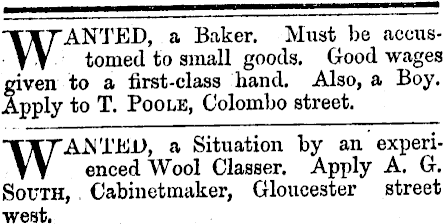 "ANTED, a Baker. Must be accustomed to small goods. Good wages iven to a first-class hand. Also, a Boy. .pply to T. Poole, Colombo street. A-NTED, a Situation by an experienced Wool Classer. Apply A. G. South, Cabinetmaker, Gloucester street west.