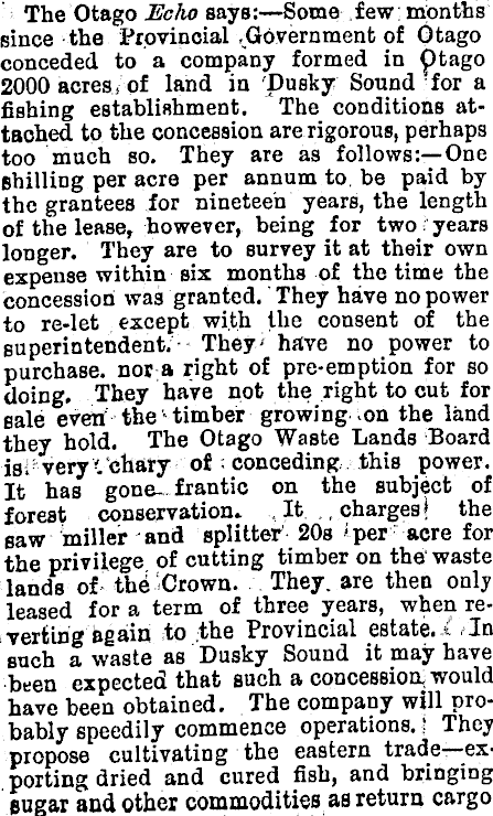 The Otago Echo says:—Some few months since the Provincial Government of Otago conceded to a company formed in ptago 2000 acres of land in Dusky Sound for a fishing establishment. The conditions attached to the concession are rigorous, perhaps too much so. They are as follows:—One Shilling per acre per annum to be paid by the grantees for nineteen years, the length of the lease, however, being for two years longer. They are to survey it at their own expense within six months of the time the concession was granted. They have no power to re-let except with the consent of the superintendent. They have no power to purchase, nor a right of pre-emption for so doing. They have not the right to cut for sale even the timber growing on the land they hold. The Otago Waste Lands Board is very .chary of conceding this power. It has gone frantic on the subject of forest conservation. It charges' the saw miller and splitter 20s per acre for the privilege of cutting timber on the waste lands of the Crown. They, are then only leased for a term of three years, when reverting again to the Provincial estate. In such a waste as Dusky Sound it may have been expected that such a concession would have been obtained. The company will probably speedily commence operations. They propose cultivating the eastern trade—exporting dried and cured fish, and bringing sugar and other commodities as return cargo