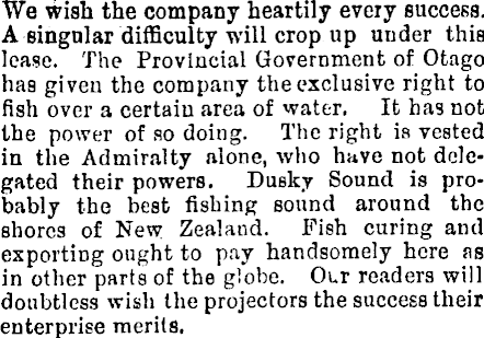 We wish the company heartily every success. A singular difficulty will crop up uuder this lease. The Provincial Government of Otago has given the company the exclusive right to fish over a certain area of water. It has not the power of so doing. The right is vested in the Admiralty alone, who have not delegated their powers. Dusky Sound is probably the best fishing sound around the shores of New Zealand. Fish curing and exporting ought to pay handsomely here as in other parts of the globe. Our readers will doubtless wish the projectors the success their enterprise merits.