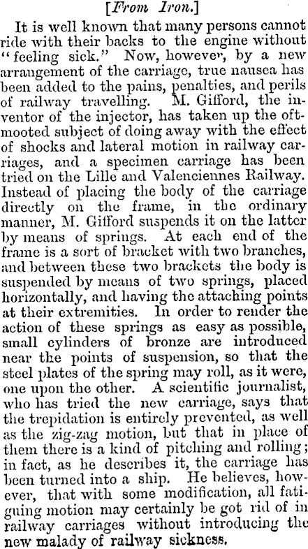 [From Iron.] It is well known that many persons cannot ride with their backs to the engine without “feeling sick.” Now, howeve'-, by a new arrangement of the carriage, true nausea has been added to the pains, penalties, and perils of railway travelling. M. Gilford, the inventor of the injector, has taken up the oftmooted subject of doing away with the effect of shocks and lateral motion in railway carriages, and a specimen carriage has been tried on the Lille and Valenciennes Railway. Instead of placing the body of the carriage directly on the frame, in the ordinary manner, M. Gilford suspends it on the latter by means of springs. At each end of the frame is a sort of bracket with two branches, and between these two brackets the body is suspended by means of two springs, placed horizontally, and having the attaching points at their extremities. In order to render the action of these springs as easy as possible, small cylinders of bronze are introduced near the points of suspension, so that the steel plates of the spring may roll, as it were, one upon the other. A scientilic journalist, who has tried the new carriage, says that the trepidation is entirely prevented, as well as the zig-zag motion, but that in place of them there is a kind of pitching and rolling; in fact, as he describes it, the carriage has been turned into a ship. He believes, however, that with some modification, all fatiguing motion may certainly be got rid of in railway carriages without introducing the new malady of railway sickness.