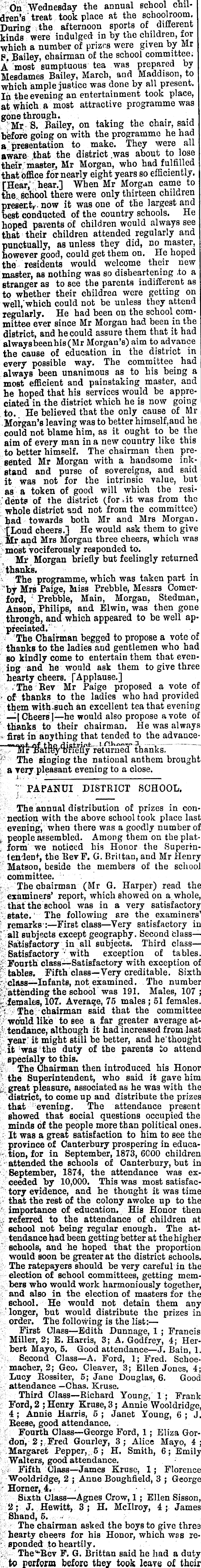 On Wednesday the annual school chil- : dren’s treat took place at the schoolroom. During the afternoon sports of different kinds were indulged in by the children, for which a number of prizes were given by Mr P. Bailey, chairman of the school committee. A most sumptuous tea was prepared by Mesdames Bailey, March, and Maddison, to which ample justice was done by all present. In the evening an entertainment took place, at which a most attractive programme was on taking the chair, said before going on with the programme he had a presentation to make. They were all aware that the district .was about to lose their master, Mr Morgan, who had fulfilled that office for nearly eight years so efficiently. [Hear, hear.] When Mr Morgan came to the school there were only thirteen children present, now it was one of the largest and best conducted of the country schools. He hoped parents of children would always see that their children attended regularly and punctually, as unless they did, no master, however good, could get them on. He hoped the residents would welcome their new master, as nothing was so disheartening .to a stranger as to see the parents indifferent as to whether their children were getting on well, which could not be unless they attend regularly. He had been on the school committee ever since Mr Morgan had been in the district, and he could assure them that it had alwaysbeenhis(Mr Morgan’s) aim to advance the cause of education in the district in every possible way. The committee had always been unanimous as to his being a most efficient and painstaking master, and he hoped that his services would be appreciated in the district which he is now going to. He believed that the only cause of Mr Morgan’s leaving was to better himself,and he could not blame him, as it ought to be the aim of every man in a new country like this to better himself. The chairman then presented Mr Morgan with a handsome inkstand and purse of sovereigns, and said it was not for the intrinsic value, but as a token of good will which the residents of the district (for it was from the whole district and not from the committee) had towards both Mr and Mrs Morgan. [Loud cheers.] He would ask them to give Mr and Mrs Morgan three cheers, which was most vociferously responded to. Mr Morgan briefly but feelingly returned thanks. The programme, which was taken part in by Mrs Paige, Miss Prebble, Messrs Comerford, Prebble, Main, Morgan, Stedman, Anson, Philips, and Elwin, was then gone through, and which appeared to be well appreciated. The Chairman begged to propose a vote of thanks to the ladies and gentlemen who had BO kindly come to entertain them that evening and he would ask them to give three hearty cheers. [Applause,] The Bev Mr Paige proposed a vote of of thanks to the ladies who had provided them with such an excellent tea that evening —| Cheers I—he1 —he would also propose a vote of thanks to their chairman. He was always first in anything that tended to the advancereturned" thanks. The singing the national anthem brought a very pleasant evening to a close. PAPANUI DISTRICT SCHOOL. The annual distribution of prizes in connection with the above school took place last evening, when there was a goodly number of people assembled. Among them on the platform we noticed his Honor the Superinfendent, the RevF. G. Brittan, and Mr Henry Matson, beside the members of the school committee. The chairman (Mr G. Harper) read the examiners’ report, which showed on a whole, that the school was in a very satisfactory state. The following are the examiners’ remarks :—First class —Very satisfactory in all subjects except geography. Second ClassSatisfactory in all subjects. Third class— Satisfactory with exception of tables. ; Fourth class —Satisfactory with exception of tables. Fifth class—Very creditable. Sixth class—lnfants, not examined. The number attending the school was 191. Males, 107 ; females, 107. Average, 75 males ; 51 females. The chairman said that the committee would like to see a far greater average attendance, although it had increased from last year' it might still be better, and be thought it was the duty of the parents to attend specially to this. The Chairman then introduced his Honor the Superintendent, who said it gave him great pleasure, associated as he was with the district, to come up and distribute the prizes that evening. The attendance present showed that social questions occupied the minds of the people more than political ones. It was a great satisfaction to him to see the province of Canterbury prospering in education, for in September, 1873, 6000 children attended the schools of Canterbury, but in September, 1874, the attendance was exceeded by 10,000. This was most satisfactory evidence, and he thought it was time that the rest of the colony awoke up to the importance of education. His Honor then referred to the attendance of children at school not being regular enough. The attendance had been getting better at the higher schools, and he hoped that the proportion would soon be greater at the district schools. The ratepayers should be very careful in the election of school committees, getting members who would work harmoniously together, and also in the election of masters for the school. He would not detain them any longer, but would distribute the prizes in order. The following is the list:— First Class —Edith Dunnage, 1 ; Francis Miller, 2; E. Harris, 3; A. Godfrey, 4; Herbert Mayo, 5. Good attendance —J. Bain, 1. Second Class—A. Ford, 1; Fred. Schoemacher, 2; Geo, Cleaver, 3; Ellen Jones, 4; Lucy Rossi ter, 5; Jane Douglas, 6. Good attendance —Chas. Kruse. Third Class—Richard Young, 1 ; Frank Ford, 2 ; Henry Kruse, 3; Annie Wooldridge, 4 ; Annie Harris, 5 ; Janet Young, 6 ; J. Reese, good attendance. Fourth Class —George Ford, 1 ; Eliza Gordon, 2 ; Fred Gourley, 3 ; Alice Mayo, 4 ; Margaret Pepper, 5 ; H. Smith, 6; Emily Walters, good attendance. Fifth Cl