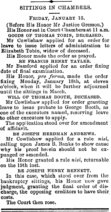 SITTINGS IN CHAMBERS. Friday, January 15. (Before His Honor Mr Justice Gresson.) His Honor sat in Court Chambers at II a.m. GOODS OF THOMAS TOBIN, DECEASED. Mr Cowlishaw applied for an order for leave to issue letters of administration to Elizabeth Tobin, widow of deceased. His Honor made the order as prayed. RE FRANCIS HENRY TAYLER. Mr Bamford applied for an order fixing date of final examination. His Honor, pro forma , made the order fixing Monday, January 18th, at eleven o’clock, when it will be further adjourned until the sittings in March. WILL OP THOMAS BOOTH, DECEASED. Mr Cowlishaw applied for order granting leave to issue probate to George Booth, as one of the executors named, reserving leave to other executors to apply. The application stood over for amendment of affidavit. RE JOSEPH HERDMAN ANDREWS. Mr Cowlishaw applied for a rule nisi, calling upon James B. Banks to show cause why his proof herein should not be expunged or amended. His Honor granted a rule nisi, returnable on the 19th inst. RE JOSEPH HENRY BENNETT. In this case, which stood over from the bankruptcy sittings, his Honor now gave judgment, granting the final order of discharge, the opposing creditors to have their costs. The Court then rose.