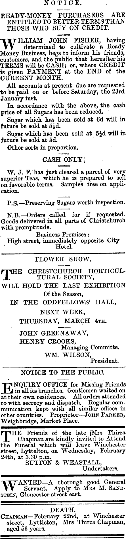 NOTICE. READY-MONEY PURCHASERS ARE ENTITLED TO BETTER TERMS THAN THOSE WHO BUY ON CREDIT. ILLIAM JOHN FISHER, having determined to cultivate a ReadyMoney Business, begs to inform his friends, customers, and the public that hereafter his TERMS will be CASH; or, where CREDIT is given PAYMENT at the END of the CURRENT MONTH. All accounts at present due are requested to be paid on or before Saturday, the 23rd January inst. In accordance with the above, the cash price of all Sugars has been reduced. Sugar which has been sold at 6d will in future be sold at s£d. Sugar which has been sold at 5Jd will in future be sold at sd. Other sorts in proportion. CASH ONLY | W. J. F. has just cleared a parcel of very superior Teas, which he is prepared to sell on favorable terms. Samples free on application. P.g.—Preserving Sugars worth inspection. N.B.—Orders called for if requested. Goods delivered in all parts of Christchurch with promptitude. Business Premises: High street, immediately opposite City Hotel. FLOWER SHOW. ,HE CHRISTCHURCH HORTICULTURAL SOCIETY, WILL HOLD THE LAST EXHIBITION Of the Season, IN THE ODDFELLOWS' HALL, NEXT WEEK, THURSDAY, MARCH 4th. JOHN GREENAWAY, HENRY CROOKS, Managing Committe. WM. WILSON, President. NOTICE TO THE PUBLIC. •INQUIRY OFFICE for Missing Friends 2d in all its branches. Gentlemen waited on at their own residences. All orders attended to with secrecy and dispatch. Regular communication kept with all similar offices in other countries. Proprietor—John Parker, Weighbridge, Market Place. HE Friends of the late jMrs Thirza Chapman are kindly invited to Attend the Funeral which will leave Winchester street, Lyttelton, on Wednesday, February 24th, at 3.30 p.m. SUTTON & WEASTALL, Undertakers. "ANTED—A thorough good General Servant. Apply to Mks M. Sandstein, Gloucester street east. DEATH. Chapman—February 22nd, at Winchester street, Lyttleton, Mrs Thirza Chapman, aged 56 years.