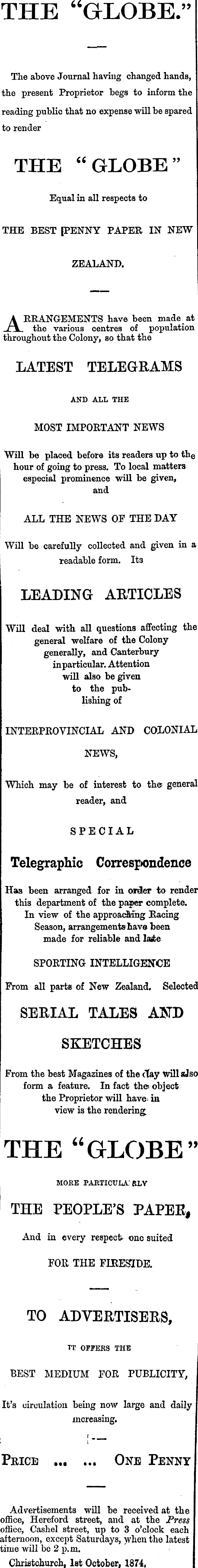 THE "GLOBE. The above Journal having changed hands, the present Proprietor begs to inform the reading public that no expense will be spared to render THE "GLOBE" Equal in all respects to THE BEST PENNY PAPER IN NEW ZEALAND. ARRANGEMENTS have been made at the various centres of population throughout the Colony, so that the LATEST TELEGRAMS AND ALL THE MOST IMPORTANT NEWS Will be placed before its readers up to th e hour of going to press. To local matters especial prominence will be given, and ALL THE NEWS OF THE DAY Will be carefully collected and given in a readable form. It 3 LEADING ARTICLES Will deal with all questions affecting the general welfare of the Colony generally, and Canterbury in particular. Attention will also be given to the publishing of INTERPROVINCIAL AND COLONIAL NEWS, Which may be of interest to the general reader, and SPECIAL Telegraphic Correspondence Has been arranged for in order to render this department of the paper complete. In view of the approacMng Racing Season, arrangements have been made for reliable and lajfce SPORTING INTELLIGENCE Prom all parts of New Zealand. Selected SERIAL TALES AND SKETCHES From the best Magazines of the clay will aJso form a feature. In fact the= object the Proprietor will have, in view is the rendering THE "GLOBE" MOKE PARTICULARLY THE PEOPLE'S PAPER, And in every respect, one suited FOR THE FIRESIDE. TO ADVERTISERS, TT OFPEKS THE BEST MEDIUM FOR PUBLICITY, It's circulation being now large and daily increasing. ... One Penny Advertisements will be received at the office, Hereford street, and at the Press office, Cashel street, up to 3 o'clock each afternoon, except Saturdays, when the latest time will be 2 p. m. Christchurch, Ist October, 1874,
