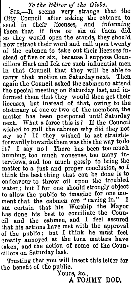 To the Editor of the Glohe, Sir, —It seems very strange that the City Council after asking the cabmen to send in their licenses, and informing them that if five or six of them did so they would open the stands, they should now retract their word and call upon twenty of the cabmen to take out their licenses instead of five or six, because I suppose Councillors Hart and Ick are such influential men in that Council that they will be able to carry that motion on Saturday next. Then again the Council asked the cabmen to attend the special meeting on Saturday last, and informed them that they would then get their licenses, but instead of that, owing to the obstinacy of one or two of the members, the matter has been postponed until Saturday next. What a farce this is ? If the Council wished to gull the cabmen why did they not say so ? IE they wished to act straightforwardly towards them was this the way to do it? I say no! There has been too much humbug, too much nonsense, too many interviews, and too much gossip to bring the matter to a just and proper conclusion, so I think the best thing that can be done is to endeavour to throw oil upon the troubled water ; but I for one should strongly object to allow the public to imagine for one moment that the cabmen are “ caving in.” I am certain that his Worship the Mayor has done his best to conciliate the Council and the cabmen, I feel assured that his actions have met with the approval of the public; but I think he must feel greatly annoyed at the turn matters have taken, and the action of some of the Councillors on Saturday last. Trusting that you will insert this letter for the benefit of the public. Yours, &c., A TOMMY DOI? (