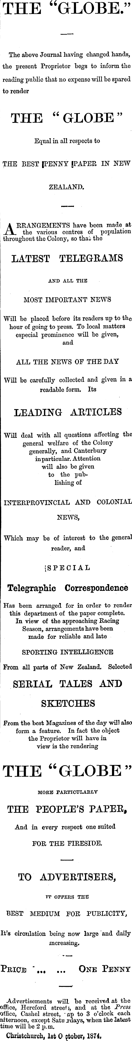 THE “GLOBE.” The above Journal having changed hands, the present Proprietor begs to inform the reading public that no expense will be spared to render THE “GLOBE” Equal in all respects to THE BEST [PENNY [PAPER IN NEW ZEALAND. ARRANGEMENTS have been made at the various centres of population throughout the Colony, so that the LATEST TELEGRAMS AND ALL THE MOST IMPORTANT NEWS Will be placed before its readers up to th e hour of going to press. To local matters especial prominence will be given, and ALL THE NEWS OF THE DAY Will be carefully collected and given in a readable form. Its LEADING ARTICLES Will deal with all questions affecting the general welfare of the Colony generally, and Canterbury in particular. Attention will also be given to the publishing of INTERPROVINCIAL AND COLONIAL NEWS, Which may be of interest to the general reader, and iSPECI AL Telegraphic Correspondence Has been arranged for in order to render this department of the paper complete. In view of the approaching Racing Season, arrangements have been made for reliable and late SPORTING INTELLIGENCE From all parts of New Zealand. Selected SERIAL TALES AND SKETCHES From the best Magazines of the day will also form a feature. In fact the object the Proprietor will have in view is the rendering THE “GLOBE” MORE PARTICULARLY THE PEOPLE’S PAPER, And in every respect one suited FOR THE FIRESIDE. TO ADVERTISERS, IT OFFERS THE BEST MEDIUM FOR PUBLICITY, It’s circulation being now large and daily increasing. Price * One Penny Advertisements will be received at the office, Hereford street j, and at the Frcss office, Cashel street, •up to 3 o’clock each afternoon, except Satu idays, when the latest time will be 2 p. m, Christchurch, Ist 0 ptober, 1874,