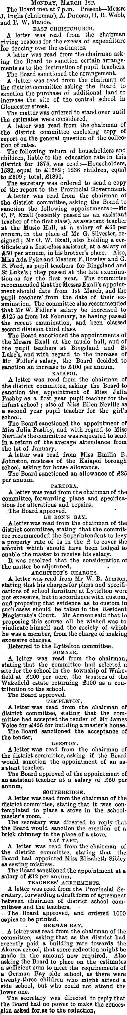 Monday, March Ist. The Board met at 7 p.m. Present —Messrs J. Inglis (chairman), A. Duncan, H. R. Webb, and T. W. Maude. EAST CHEISTCHURCH. A letter was read from the chairman giving reasons for the excess of expenditure for fencing over the estimates. A letter was read from the chairman asking the Board to sanction certain arrangements as to the instruction of pupil teachers. The Board sanctioned the arrangement. A letter was read from the chairman of the district committee asking the Board to sanction the purchase of additional land to increase the site of the central school in Gloucester street. The matter was ordered to stand over until the estimates were considered. A letter was read from the chairman of the district committee enclosing copy of report on the general question of the collection of rates. The following return of householders and children, liable to the education rate in this district for 1875, was read: —Householders, 1582, equal to £1582; 1236 children, equal to £309 ; total, £lß9l. The secretary was ordered to send a copy of the report to the Provincial Government. A letter was read from the chairman of the district committee, asking the Board to sanction the following appointments: —Mr 0. F. Exall (recently passed as an assistant teacher of the first class), as assistant teacher at the Music Hall, at a salary of £65 per annum, in the place of Mr G. Silvester, resigned ; Mr O. W. Bxall, also holding a certificate as a first-class assistant, at a salary of £SO per annum, in his brother's place. Also, Miss Ada Pykeand Masters F. Bowley and G. B. Ford, as pupil teachers for Bingsland and St Luke's ; they passed at the late examination as for the first year. The committee recommended that the Messrs Exall's appointment should date from Ist March, and the pupil teachers' from the date of their examination. The committee also recommended that Mr W. Fidler's salary be increased to £125 as from Ist February, he having passed the recent examination, and been classed second division third class. The Board sanctioned the appointments of the Messrs Exall at the music hall, and of the pupil teachers at Bingsland and St Luke's, and with regard to the increase of Mr Fidler's salary, the Board decided to sanction an increase to £IOO per annum. KAIAPOI. A letter was read from the chairman of the district committee, asking the Board to sanction the appointment of Miss Julia Pashby as a first year pupil teacher for the infant school ; also of Miss Ellen Neville as a second year pupil teacher for the girl's school. The Board sanctioned the appointment of Miss Julia Pashby, and with regard to Miss Neville's the committee was requested to send in a return of the average attendance from the Ist of January. A letter was read from Miss Emilia B. Johnston, mistress of the Eaiapoi borough school, asking for house allowance. The Board sanctioned an allowance of £25 per annum. PAREORA. A letter was read from the chairman of the committee, forwarding plans and specifications for alterations and repairs. The Board approved. LE BON'S BAY. A letter was read from the chairman of the district committee, stating that the committee recommended the Superintendent to levy a property rate of Is in the £ to cover the amount which should have been lodged to enable the master to receive his salary. It was resolved that the consideration of the matter be adjourned. ARCHITECT'S CHARGES. A letter was read from Mr W. B. &.rmson, stating that his charges for plans and specifications of school furniture at Lyttelton were not excessive, but in accordance with custom, and proposing that evidence as to custom in such cases should be taken in the Resident Magistrate's Court. Mr Armson said that in proposing this course all he wished was to vindicate himself and the society of which he was a member, from the charge of making excessive charges. Beierred to the Lyttelton committee. SUMNER. A letter was read from the chairman, stating that the committee had selected a site for the school in the township of Wakefield at £2OO per acre, the trustees of the Wakefield estate returning £IOO as a contribution to the school. The Board approved. TEMPLETON; A letter was read from the chairman of district committee, stating that the committee had accepted the tender of Mr James Voice for £425 for building a master's house. The Board sanctioned the acceptance of the tender. LEESTON. A letter was read from the chairman of the district committee, asking if the Board would sanction the appointment of an assistant teacher. The Board approved of the appointment of an assistant teacher at a salary of £SO per annum. SOUTHBRIDGE. A letter was read from the chairman of the district committee, stating that it was contemplated to place a stove in the schoolmaster's room. The secretary was directed to reply that the Board would sanction the erection of a brick chimney in the place of a stove. TAI TAPU. A letter was read from the chairman of the district committee, stating that the Board had appointed Miss Elizabeth Sibley as sewing mistress. The Board sanctioned the appointment at a salary of £l2 per annum. TEACHERS' AGREEMENTS. A letter was read from the Provincial Secretary, forwarding a draft form of agreement between chairmen of district school committees and the teachers. The Board approved, and ordered 1000 copies to be printed. GERMAN BAY. A letter was read from the chairman of the committee, asking that as the district had recently paid a building rate towards the Akaroa school, that some reduction might be made in the amount now required. Also asking the Board to place on the estimates a sufficient sum to meet the requirements of a German Bay side school, as there were twenty-three children who might attend a side school, but who could not attend the lower one. The secretary was directed to reply that the Board had no power to make the concession asked for as to the reduction,