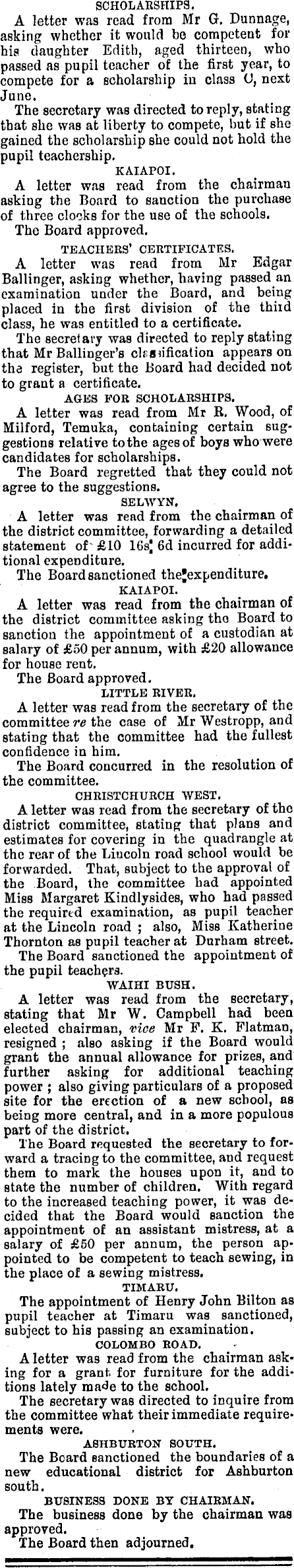 SCHOLARSHIPS. A letter was read from Mr G. Dunnage, asking whether it would be competent for his daughter Edith, aged thirteen, who passed as pupil teacher of the first year, to compete for a scholarship in class (J, next June. The secretary was directed to reply, stating that she was at liberty to compete, but if she gained the scholarship she could not hold the pupil teachership. KAIAPOI. A letter was read from the chairman asking the Board to sanction the purchase of three clocks for the use of the schools. The Board approved. TEACHERS' CERTIFICATES. A letter was read from Mr Edgar Ballinger, asking whether, having passed an examination under the Board, and being placed in the first division of the thiid class, he was entitled to a certificate. The secretary was directed to reply stating that Mr Ballinger's clarification appears on the register, but the Board had decided not to grant a certificate. AGES FOR SCHOLARSHIPS. A letter was read from Mr R. Wood, of Milford, Temuka, containing certain suggestions relative to the ages of boys who were candidates for scholarships. The Board regretted that they could not agree to the suggestions. SELWYN. A letter was read from the chairman of the district committee, forwarding a detailed statement of £lO 16s; 6d incurred for additional expenditure. The Board sanctioned thejexpenditure. KAIAPOI. A letter was read from the chairman of the district committee asking the Board to sanction the appointment of a custodian at salary of £SO per annum, with £2O allowance for house rent. The Board approved. LITTLE RIVER. A letter was read from the secretary of the committee re the case of Mr Westropp, and stating that the committee had the fullest confidence in him. The Board concurred in the resolution of the committee. CHRISTCHURCH WEST. A letter was read from the secretary of the district committee, stating that plans and estimates for covering in the quadrangle at the rear of the Liucoln road school would be forwarded. That, subject to the approval of the Board, the committee had appointed Miss Margaret Kindlysides, who had passed the required examination, as pupil teacher at the Lincoln road ; also, Miss Katherine Thornton as pupil teacher at Durham street. The Board sanctioned the appointment of the pupil teachers. WAIHI BUSH. A letter was read from the secretary, stating that Mr W. Campbell had been elected chairman, vice Mr F. K. Flatman, resigned ; also asking if the Board would grant the annual allowance for prizes, and further asking for additional teaching power ; also giving particulars of a proposed site for the erection of a new school, as being more central, and in a more populous part of the district. The Board requested the secretary to forward a tracing to the committee, and request them to mark the houses upon it, and to state the number of children. With regard to the increased teaching power, it was decided that the Board would sanction the appointment of an assistant mistress, at a salary of £SO per annum, the person appointed to be competent to teach sewing, in the place of a sewing mistress. TIMARU. The appointment of Henry John Bilton as pupil teacher at Timaru was sanctioned, subject to his passing an examination. COLOMBO ROAD. A letter was read from the chairman asking for a grant for furniture for the additions lately made to the school. The secretary was directed to inquire from the committee what their immediate requirements were. ASHBURTON SOUTH. The Beard sanctioned the boundaries of a new educational district for Ashburton south. BUSINESS DONE BY CHAIRMAN. The business done by the chairman was approved. The Board then adjourned.