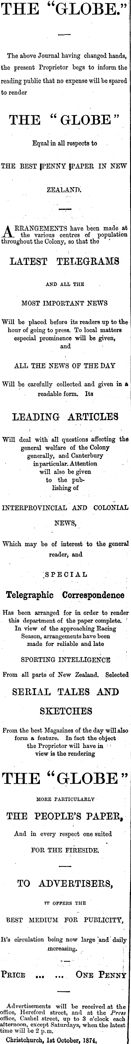 THE "GLOBE." The above Journal having changed hands, the present Proprietor begs to inform the reading public that no expense will be spared to render THE "GLOBE Equal in all respects to THE BEST pENNY JPAPER IN NEW ZEALAND. RRANGEMENTS have been made at . the various centres of population throughout the Colony, so that the LATEST TELEGRAMS AND ALL THE MOST IMPORTANT NEWS Will be placed before its readers up to the hour of going to press. To local matters especial prominence will be given, and ALL THE NEWS OF THE DAY Will be carefully collected and given in a readable form. Its LEADING ARTICLES Will deal with all questions affecting the general welfare of the Colony generally, and Canterbury in particular. Attention will also be given to the publishing of INTERPROVINCIAL AND COLONIAL NEWS, Which may be of interest to the general reader, and .SPECIAL Telegraphic Correspondence Has been arranged for in order to render this department of the paper complete. In view of the approaching Racing Season, arrangements have been made for reliable and late SPORTING INTELLIGENCE Prom all parts of New Zealand. Selected SERIAL TALES AND SKETCHES Prom the best Magazines of the day will also form a feature. In fact the object the Proprietor will have in view is the rendering THE "GLOBE" MORE PARTICULARLY THE PEOPLE'S PAPER, And in every respect one suited FOR THE FIRESIDE. TO ADVERTISERS, TT OFFERS THE BEST MEDIUM FOR PUBLICITY, It's circulation being now large "and daily increasing. Price ... ... One Penny Advertisements will be received at the office, Hereford street, and at the Press office, Cashel street, up to 3 o'clock each afternoon, except Saturdays; when the latest time will be 2 p. m. , Christchurch, Ist October, 1874, ,