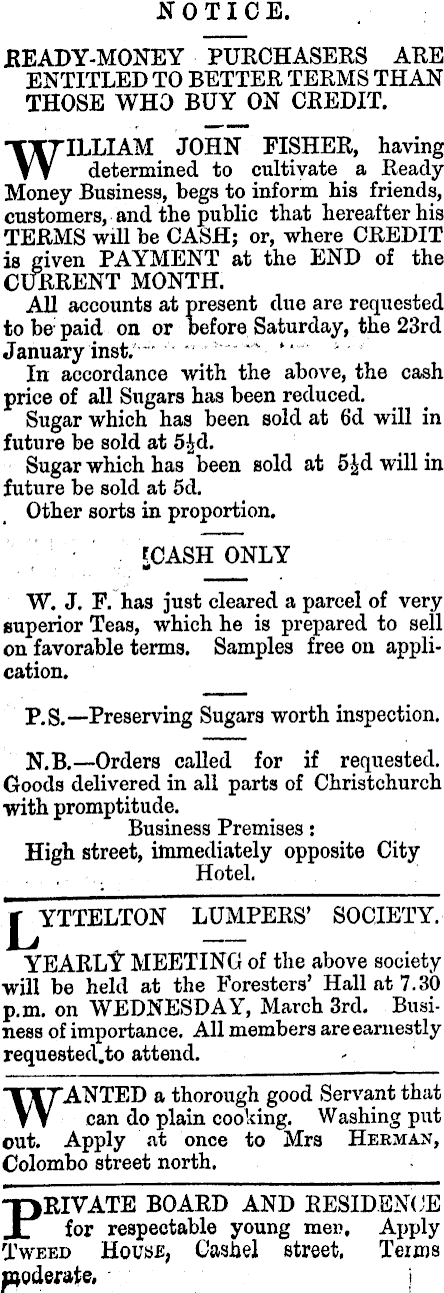 NOTICE. BEADY-MONEY PURCHASERS ARE ENTITLED TO BETTER TERMS THAN THOSE WHO BUY ON CREDIT. "ILLIAM JOHN FISHER, having determined to cultivate a Ready Money Business, begs to inform his friends, customers, and the public that hereafter his TERMS will be CASH; or, where CREDIT is given PAYMENT at the END of the CURRENT MONTH. All accounts at present due are requested +.n l-io'nairl nn nv hpf nr A Sat.nrflav. t.hfi 2Srrl January inst. In accordance with the above, the cash price of all Sugars has been reduced. Sugar which has been sold at 6d will in future be sold at s£d. Sugar which has been sold at s|d will in future be sold at sd. Other sorts in proportion. fCASH ONLY W. J. P. has just cleared a parcel of very superior Teas, which he is prepared to sell on favorable terms. Samples free on application. P. S.— Preserving Sugars worth inspection. N.B.—Orders called for if requested. Goods delivered in all parts of Christchurch with promptitude. Business Premises: High street, immediately opposite City Hotel. YTTELTON LUMPERS' SOCIETY. YEARLY MEETING of the above society will be held at the Foresters' Hall at 7.30 p.m. on WEDNESDAY, March 3rd. Business of importance. All members are earnestly requested.to attend. ANTED a thorough good Servant that can do plain coolring. Washing put out. Apply at once to Mrs Hekman, Colombo street north. MVATE BOARD AND RESIDENCE for respectable young mei\ Apply Tweed House, Cashel street. Teims moderate,