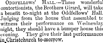 Oddfellows Hall.—Those wonderful contortionists, the Brothers Girard, will take a benefit to-night at the Oddfellows' Hall. •Judging from the house that assembled to witness their performance on Wednesday night, they should have a bumper house this evening. They give their laat performances in Chrietchurch to-morrow.